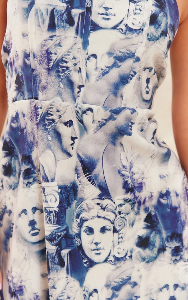 Robe patineuse bleue imprimé Renaissance en mesh tissé à liserés