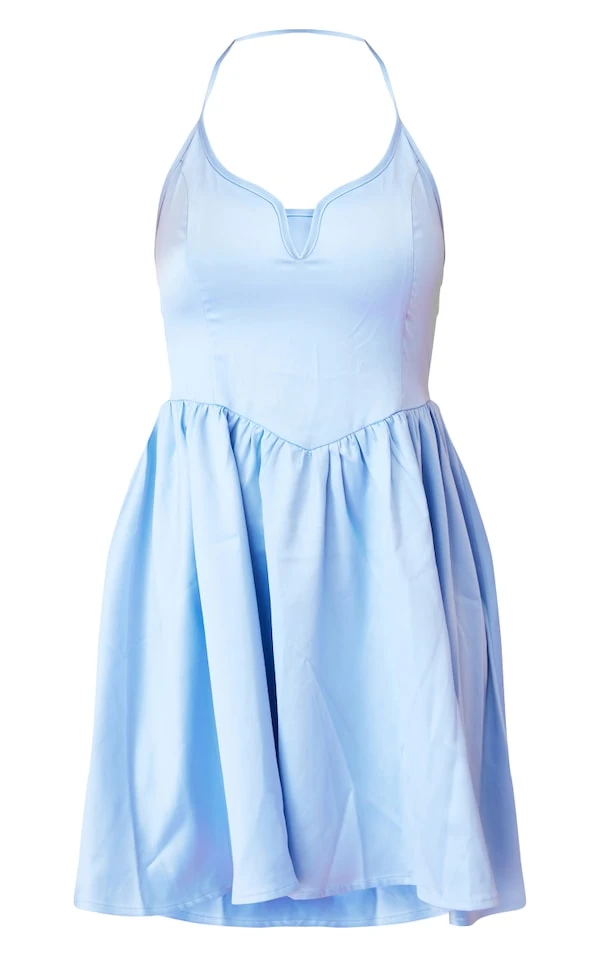 Robe Patineuse Satinée Décolletée Bleu Ciel à Dos Nu