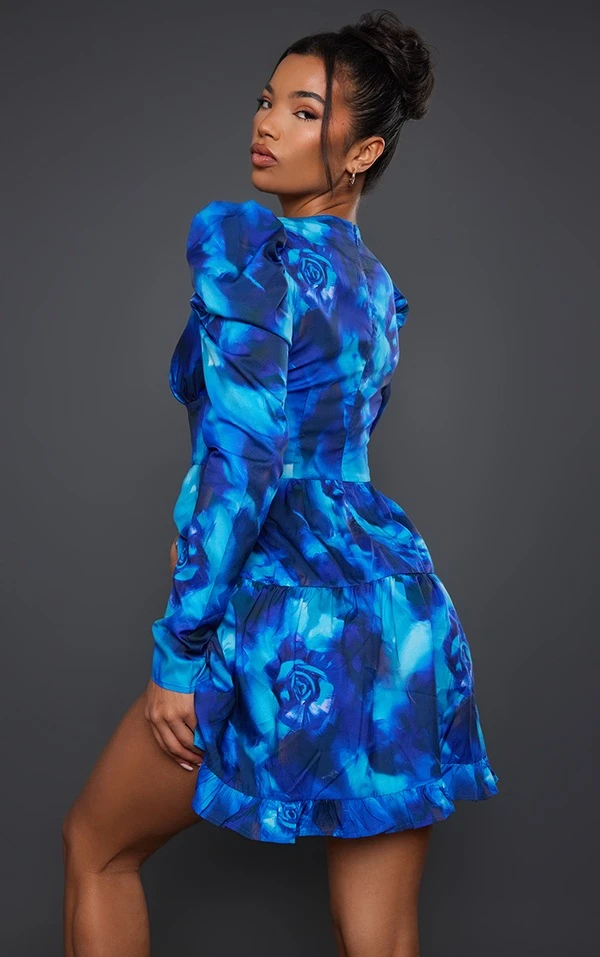 Robe Rétro Bleue Fleurie à Manches Bouffantes Et Ourlet Volanté