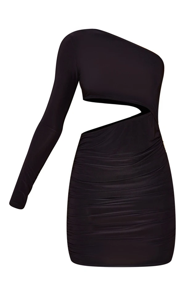 Robe très moulante asymétrique noire à taille découpée et fronces