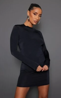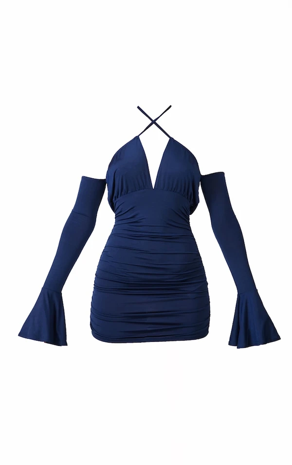Robe très moulante bleu marine foncé col bardot à manches flare et lien à nouer