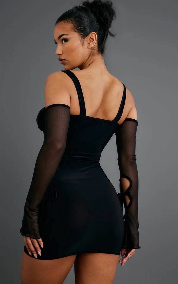 Robe très moulante noire à buste froncé et manches découpées en mesh