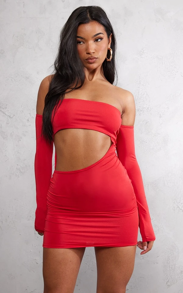Robe très moulante rouge à col bardot et découpes