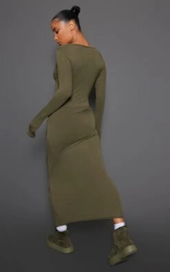 Robe Moulante En Jersey Kaki Manches Longues à Détail Coutures