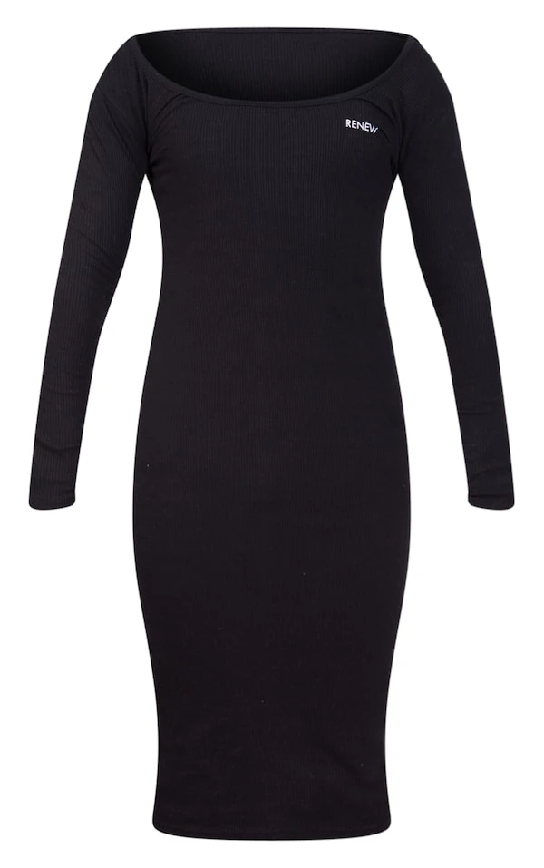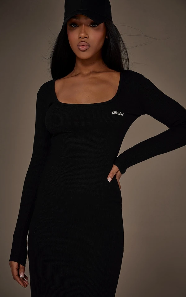 Renew Robe mi-longue très côtelée noire à col carré